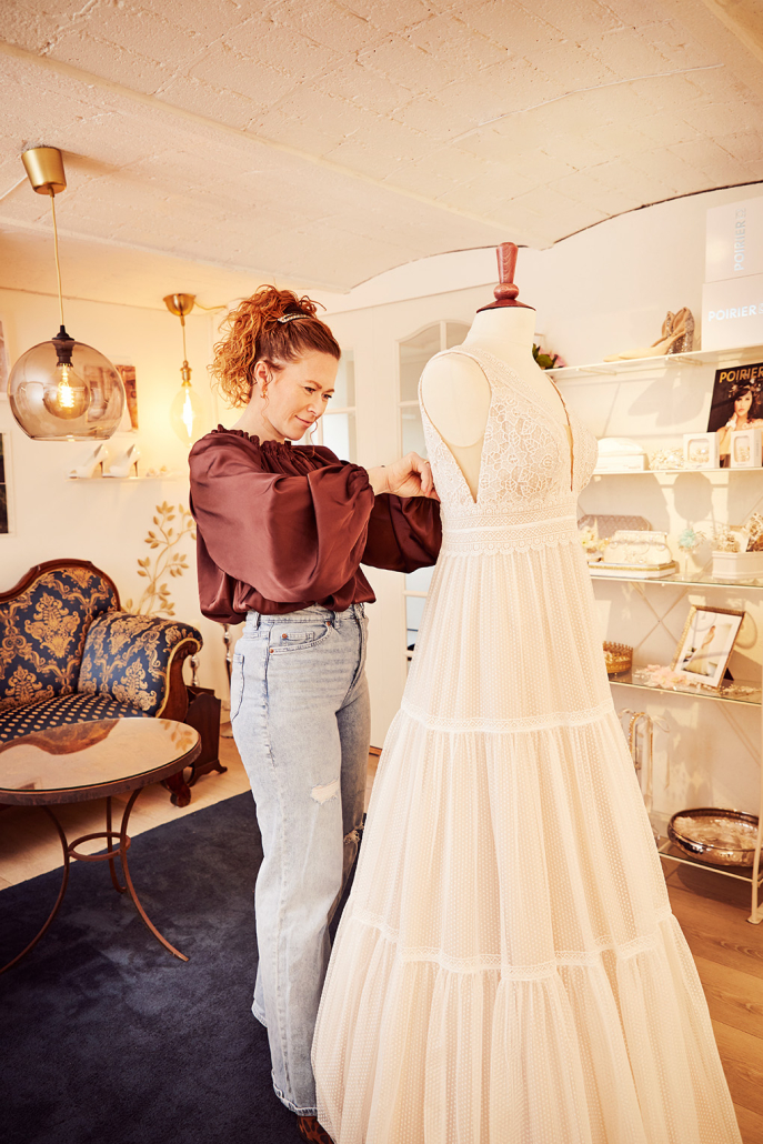 ”Jeg udfordrer dig, hvis du har lyst til at teste dine egne idéer – for mange ender med at vælge noget helt andet end forventet. Et sted mellem landlig idyl og bløde stoffer finder du roen til at mærke efter. Og finder du ikke kjolen i dag, lover jeg dig, at du går herfra med en viden, der gør dig klogere på, hvilken type kjole du skal forfølge.”