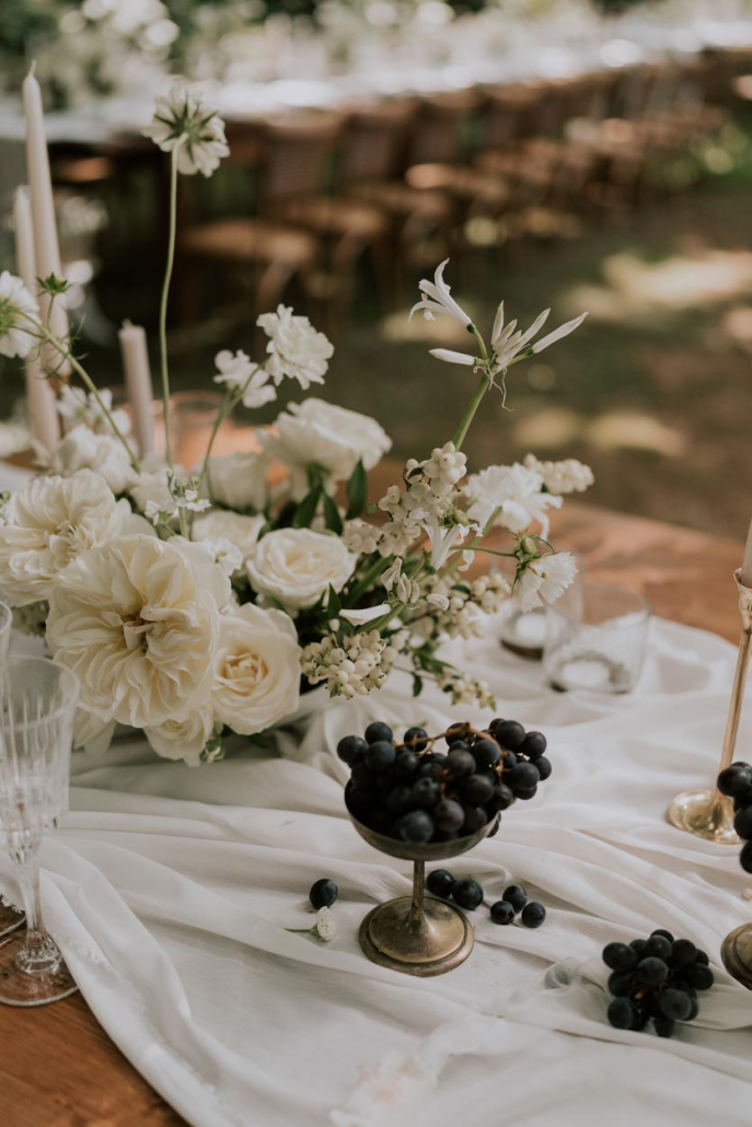 For en vintage-romantisk stil, brug duge og servietter med blonde eller broderi. Vælg service med blomsterdesign eller fine mønstre, og brug antikke glas og bestik. Dekorér bordet med gamle bøger, små vaser med haveblomster og lys i glaslysestager. Personlige elementer som billeder af brudeparret fra deres forhold eller små breve til gæsterne kan gøre borddækningen unik og meningsfuld.