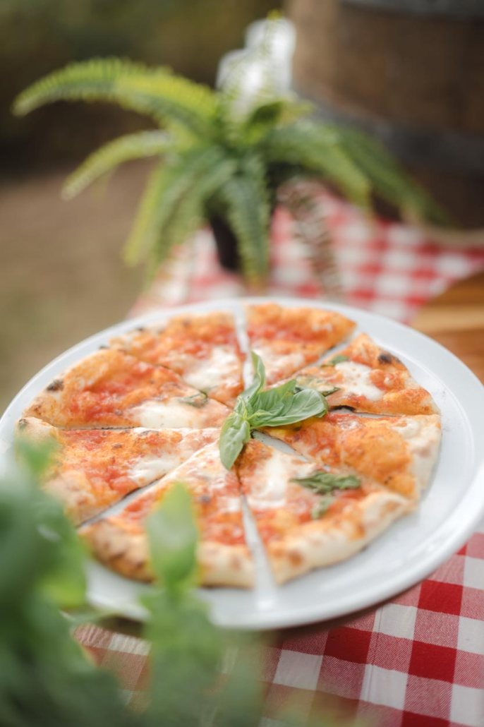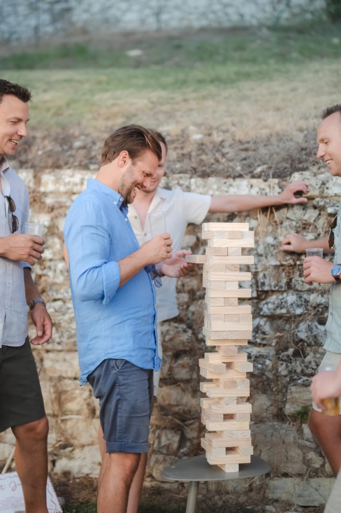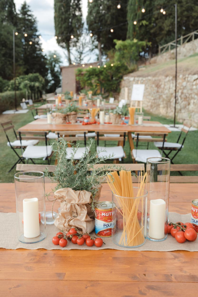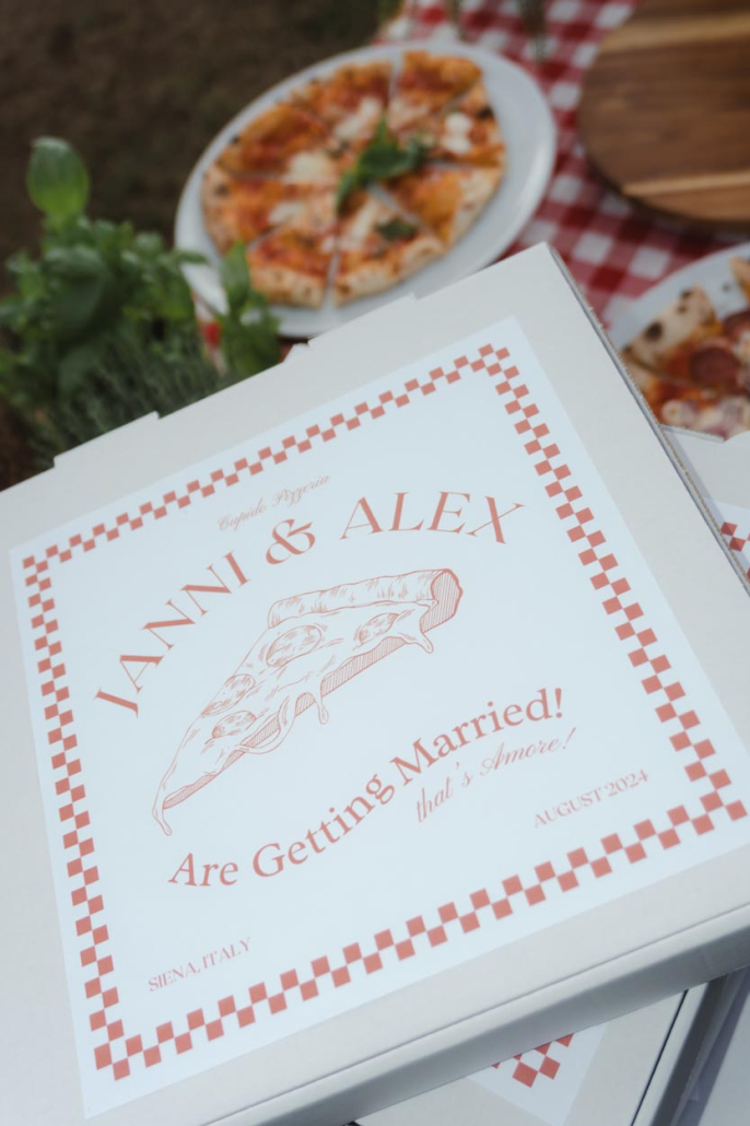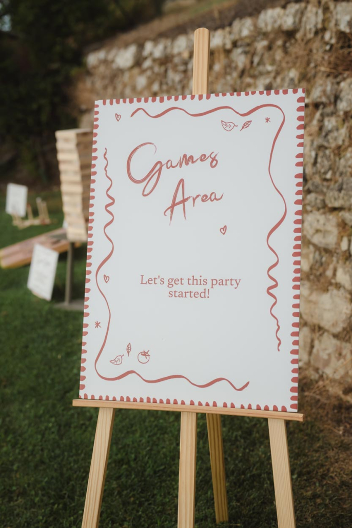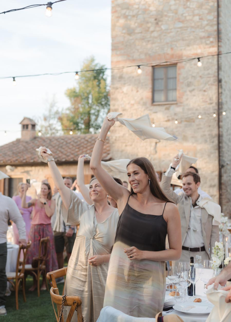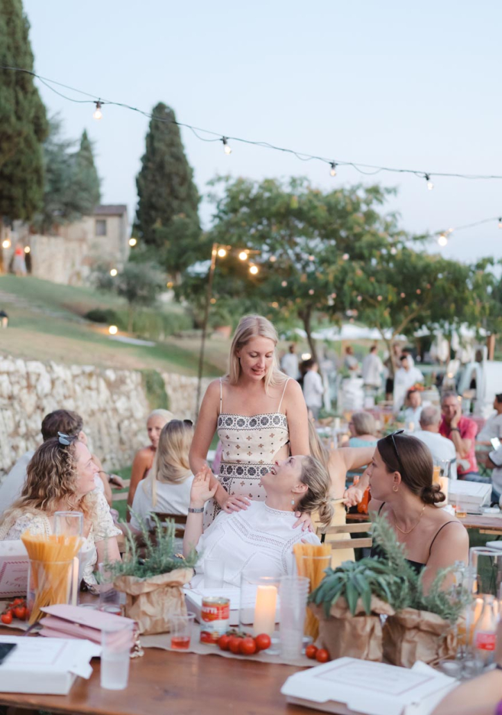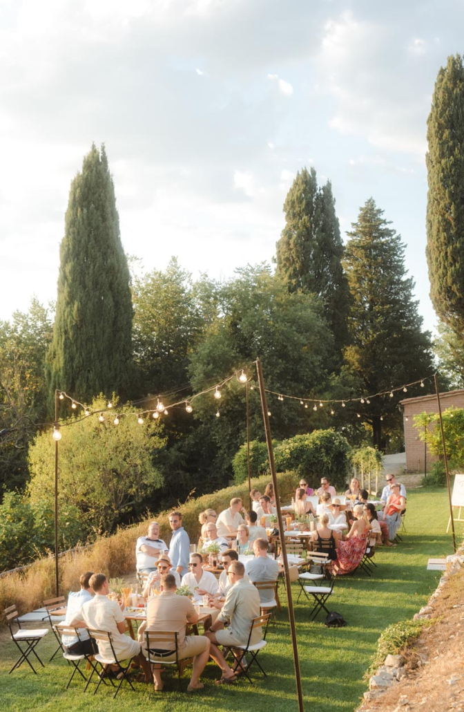 Første dag startede med et afslappet ’welcome pizza pool party’, hvor gæsterne kunne tjekke ind fra kl. 15, og der ventede dem velkomstposer med snacks og drikkevarer samt et hangover kit. Efter ankomst kastede gæsterne sig straks i poolen med prosecco i hånden. Pizza-truck og drinks fra en vespa-bar satte den perfekte uformelle stemning, og vi nød at se vores gæster hygge sig og konkurrere i diverse gigantiske havespil. Stemningen var præget af latter og lethed, hvor folk hurtigt lærte hinanden at kende, hvilket var lige præcis den intime atmosfære, vi havde håbet på. Børnene legede sammen, og de voksne slog sig ned ved langborde og på picnic tæpper, mens solnedgangen malede himlen over Toscana i dybe røde og orange nuancer. Da mørket faldt på, tændte lyskæderne, og festen fortsatte med havespil, pool-dyp og drinks under stjernerne.