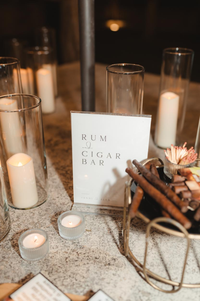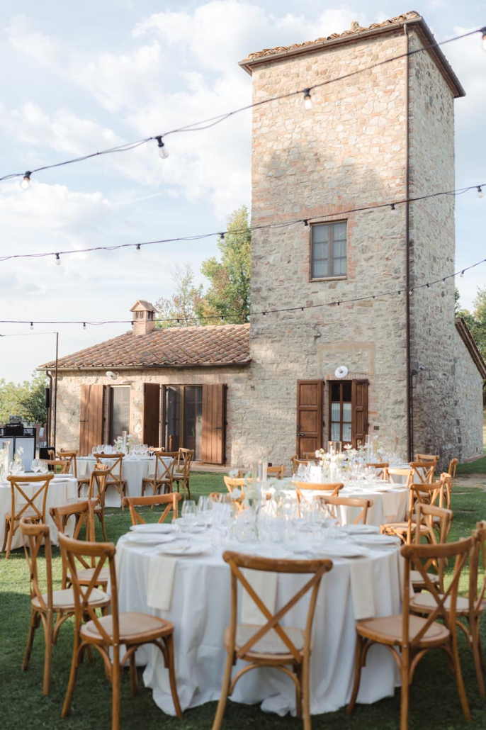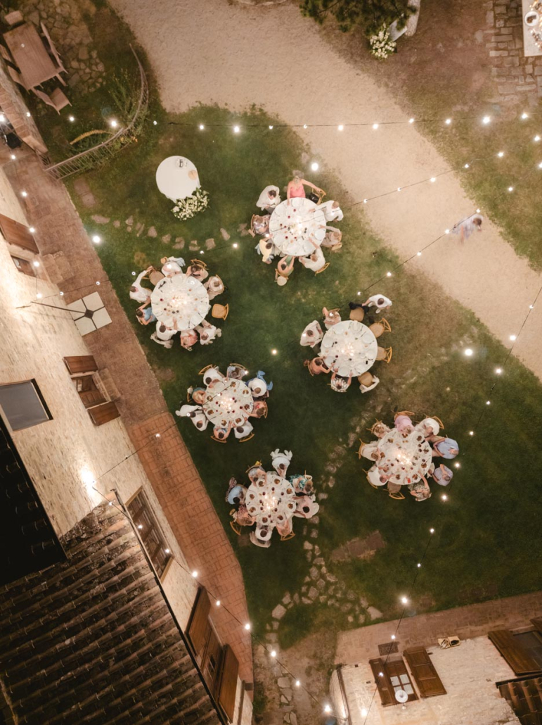 Middagen blev afholdt i et andet område ved borgens ældste område ’Borgo Alto’, hvor vi havde fået sat runde borde op i elegante lette farver og materialer med levende lys og lyskæder, et smukt prosecco tower til at starte festen samt en rustik cigar & rum bar til at afslutte middagen med.