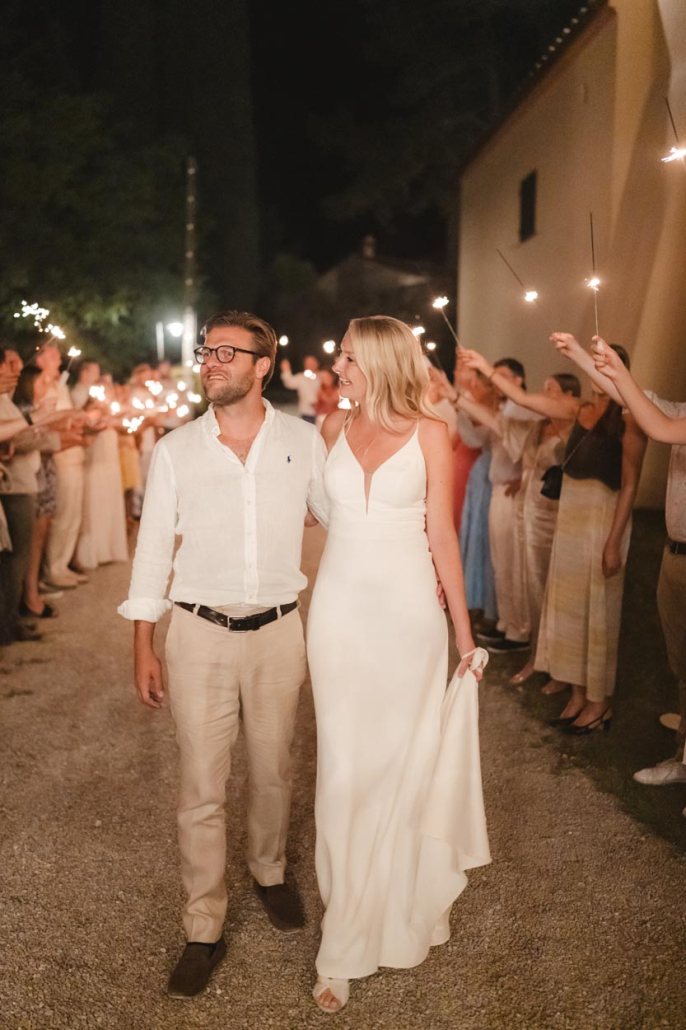 Aftenen blev sluttet af med et brag med stjernekastere, vores første dans som ægtepar, og vild fest til kl.04 med den bedste DJ i vinkælderen der spillede alt vi havde bedt om, og fri bar med drinks. Vi havde ved vores tasting i Italien et par måneder før brylluppet også besøgt baren der stod for vores drinks, så vi kunne vælge 4 signaturdrinks vi ønskede serveret til natten, og det fungerede sublimt. Flere gæster tog et dyp i poolen sidst på natten, så festen varede til den lyse morgen.
