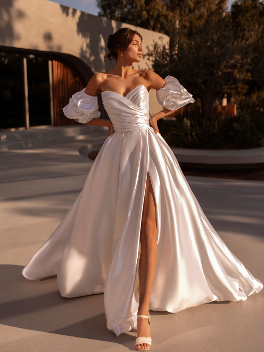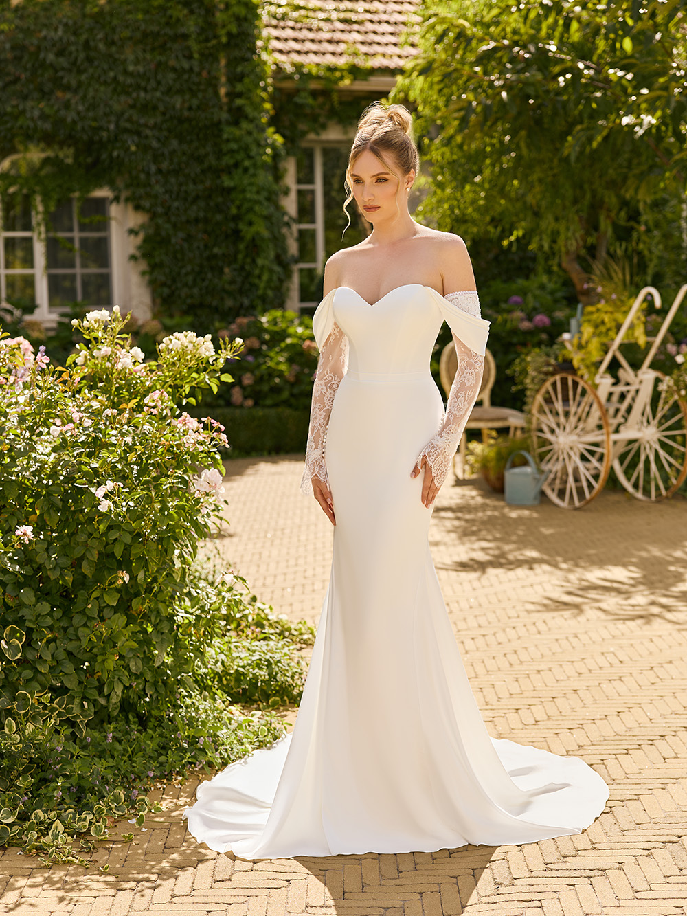 Denne elegante satin-crepe-kjole har en skulptureret sweetheart-udskæring, der fremhæver dekolletagen med naturlig elegance. Den figursyede silhuet følger kroppens linjer og løber ud i et rent, moderne slæb for en raffineret finish. Aftagelige off-shoulder-ærmer med intrikate blondedetaljer tilføjer romantik og alsidighed, så bruden let kan skifte mellem klassisk og moderne udtryk.