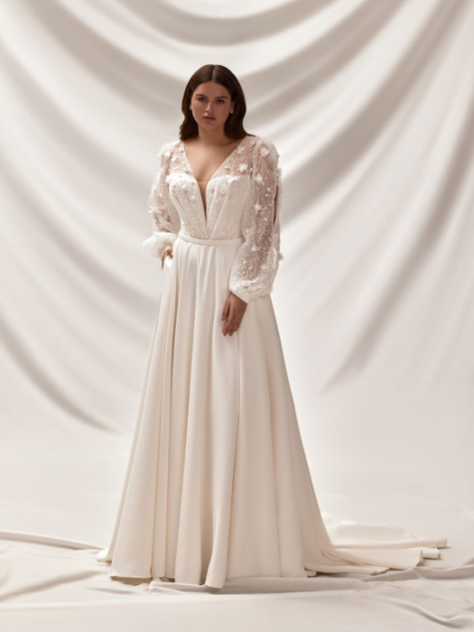 En smuk og romantisk A-line brudekjole i tyl med de smukkeste blonder der fra overkroppen fader ned i skøretet og give den sammenhæng. Kjolen har en sart nude bundfarve. Den har illussionen af dyb kavalergang men med en Ivory mesh som danner rund halsudskæring, små korte ærmer og giver kjolen en smuk og dekorativ lukket ryg, som men sin transparenthed giver kjolen en illussion af v-udskæring.
