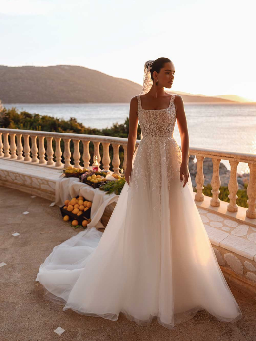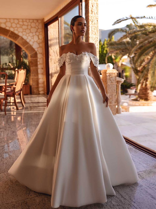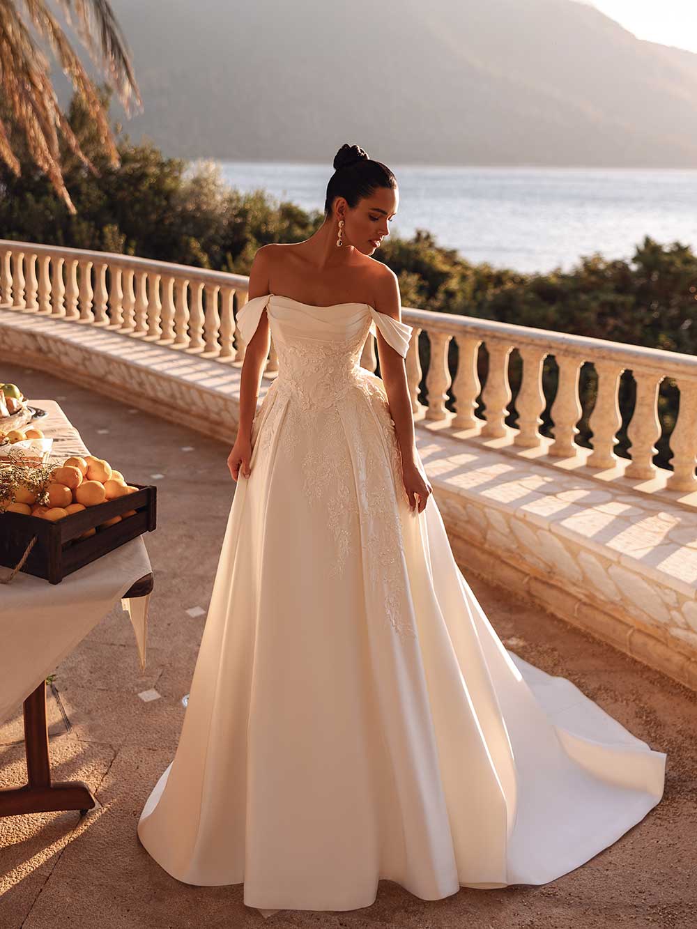 Tidløs romantik møder moderne detaljerigdom i denne A-formede mikadokjole. Broderede blondeapplikationer indrammer livet og falder let over skørtet. Off shoulder-ærmer fuldender det klassiske udtryk.