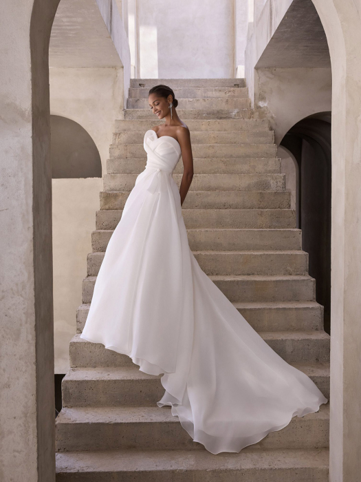 Style 8256 er den perfekte balance mellem wow-effekt og elegance. Kjolen er skabt i Mikado eller satin og har off-shoulder-udskæring, plisseret overdel, blomsterapplikationer og en fyldig A-line-skørt.