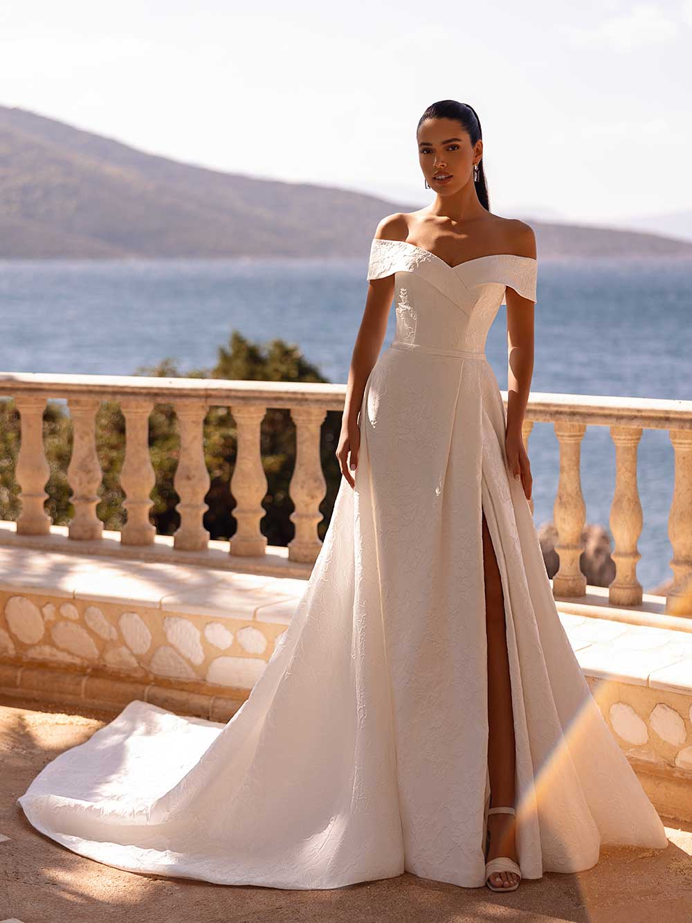 Elegant A-formet kjole med off shoulder-udskæring, blødt brokadestof og skulptureret liv. En høj slids giver et uventet og moderne løft til det ellers klassiske udtryk.