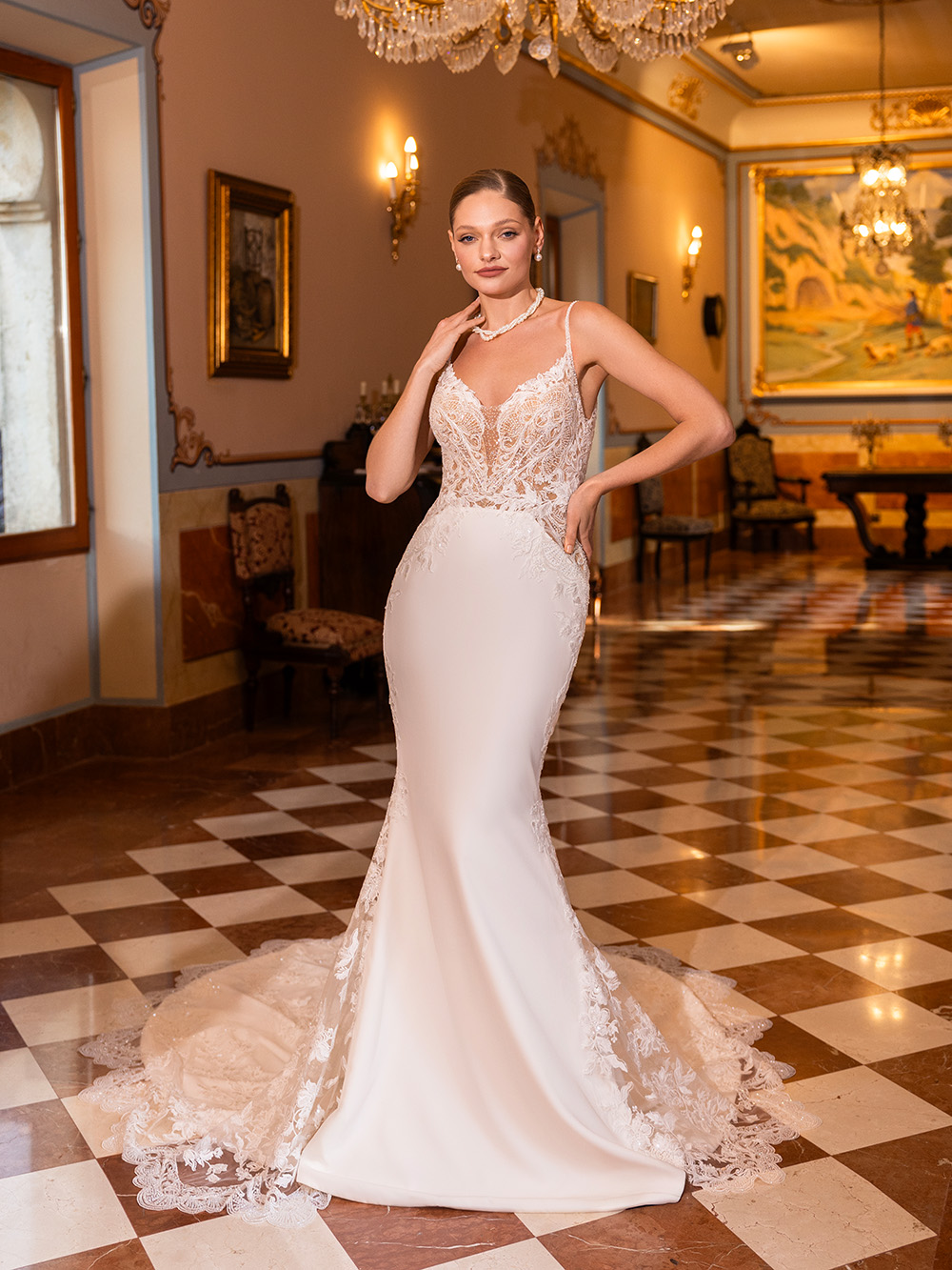Denne betagende kjole hylder moderne romantik. Den gennembrudte blondeoverdel med tynde stropper fremhæver silhuetten, og det slanke crepéskørt med blondedetaljer og dramatisk slæb skaber tidløs elegance.