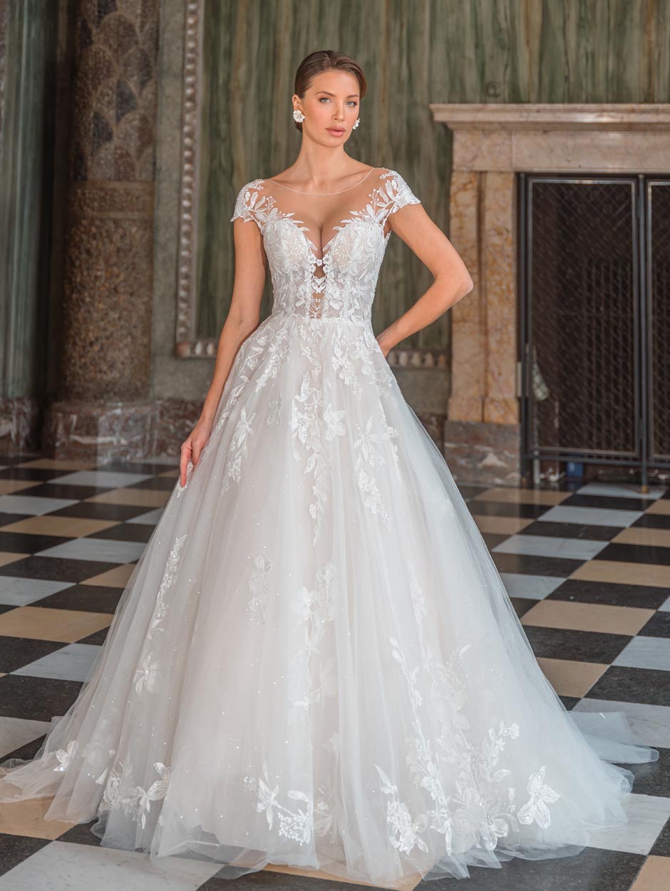 En romantisk brudekjole med illusion-V-udskæring, blondedetaljer på skuldrene og dyb ryg. Det glitrende tylskørt med blomsterapplikationer skaber en eventyrlig silhuet.