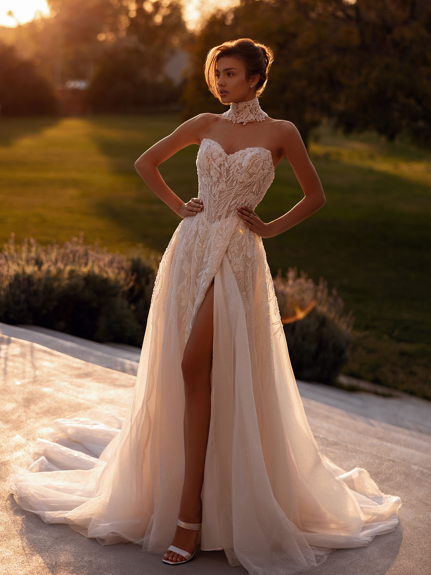 En ægte showstopper med et uventet twist. Denne stropløse kjole funkler i perlebroderet blonde og glitrende tyl. Den flirtende hjerteformede udskæring kombineres med en høj slids, som giver et ubesværet glamourøst udtryk. Fuldfør looket med den matchende statement-halskæde (COL9) for et moderne og fashion-forward finish.
