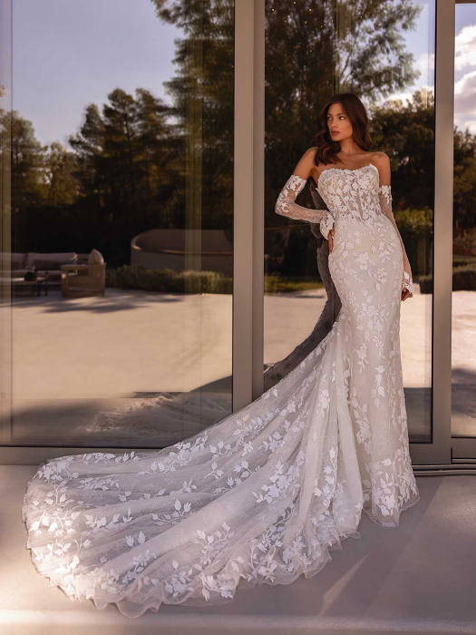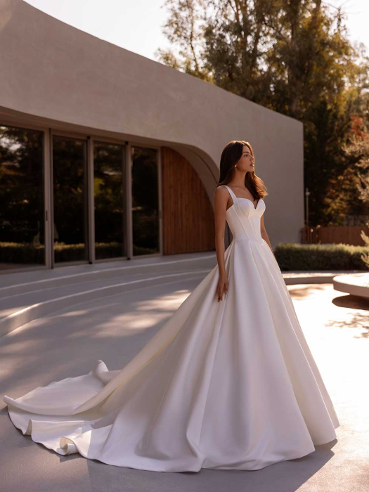 En moderne balkjole med perlebroderier, sweetheart-udskæring og dristig slids. De voluminøse ærmer (SL103, sælges separat) og det skinnende mikadoskørt gør denne kjole til et ægte showstopper.