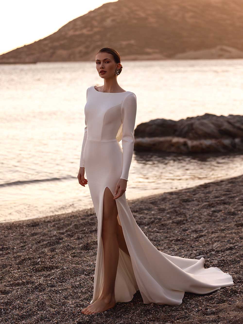 Rene linjer og sofistikeret stil præger denne kjole i crepe med bådudskæring, lange ærmer og kropsnær silhuet. En diskret slids tilføjer subtil sensualitet (findes også uden, se Style DR439).