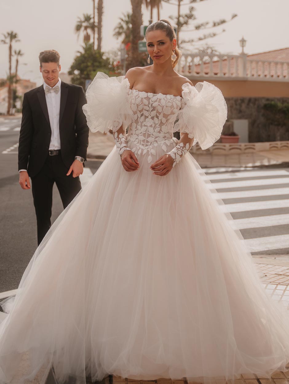 En prinsesseinspireret brudekjole i blonde og tyl med Bardot-overdel, taljeret basqueliv og aftagelige voluminøse ærmer. Perfekt til en stor bryllupsdag.