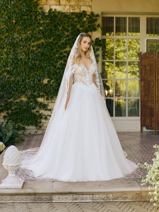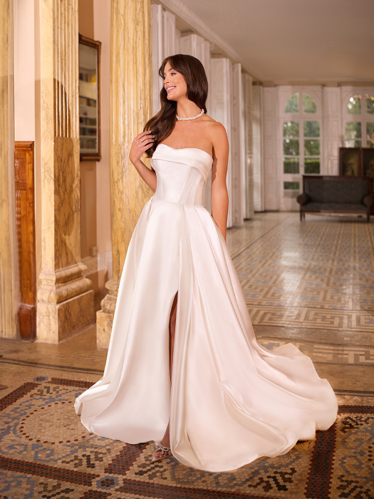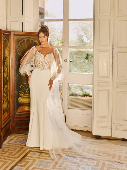 Elegant LILLY brudekjole i havfruefacon, lavet af luksuriøst stretchstof, der smyger sig perfekt til kroppen. Den sensuelle V-udskæring på overdelen er omkranset af påsatte blonder, som tilfører et romantisk touch.