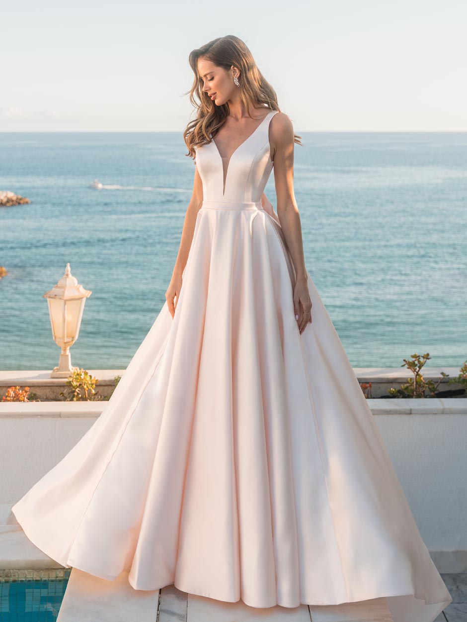 En klassisk brudekjole i satin med dyb V-udskæring, markeret talje og en smuk sløjfe bagpå. Det blødt udsvingede skørt og slæbet giver en eventyrlig følelse.