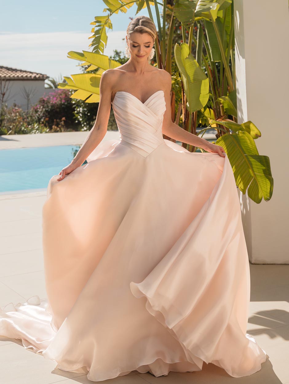 Denne brudekjole i organza har en stropløs, draperet overdel, snøreryg og et voluminøst skørt med aftagelig sløjfe. Let, lyserød og yndefuld.