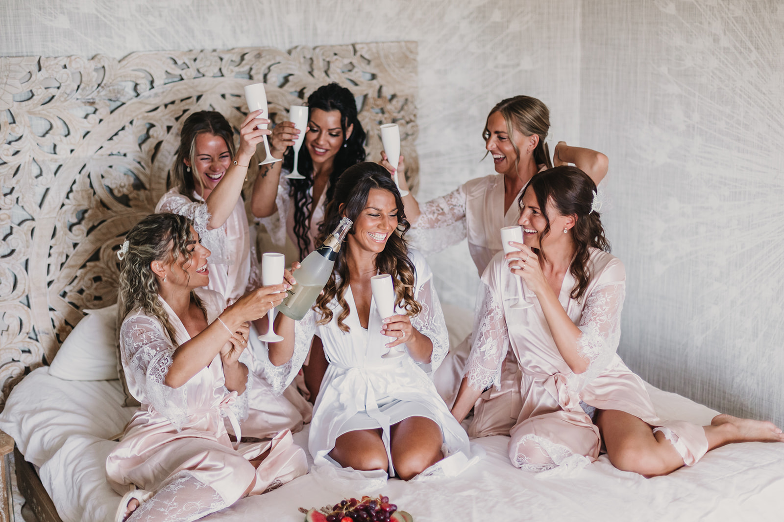 Dagen begyndte med bobler og smil. Matilda og hendes brudepiger samledes i silkebløde morgenkåber på soveværelset – der var sommerfugle i maven, men mest af alt kærlighed og glæde. Med champagne i glassene og rolig musik i baggrunden blev bruden gjort klar til måske sit livs smukkeste dag.